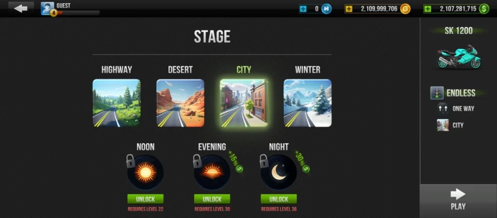 The game controls are very simple, fun, and easy to pick up. You can use tilt OR touch options to steer your bike, avoid traffic at full speed, and earn rewards by overtaking the other vehicles. You can choose any location, such as a Village, a City, Mountains, or streets. You are using a modified version of the game, so everything will be unlocked for you. You can choose any map location, game mod, and day timing to enjoy the riding.
